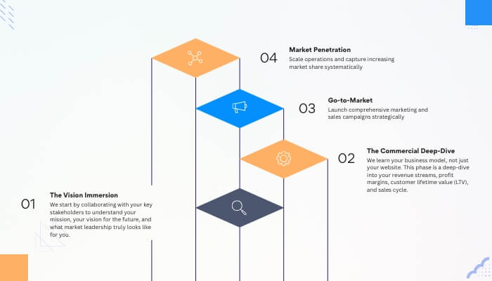 Outsiders deliver surface-level work. We believe true growth comes from deep integration. Our process begins with a complete immersion into your business model, sales cycle, and profit margins. We learn what drives your P&L, not just what ranks on Google. This commercial intelligence allows us to architect a strategy that delivers real ROI and makes us a true, indispensable partner in your success.